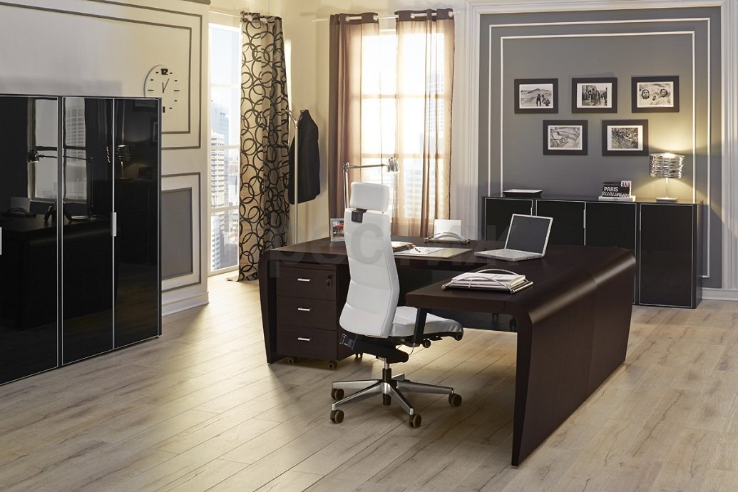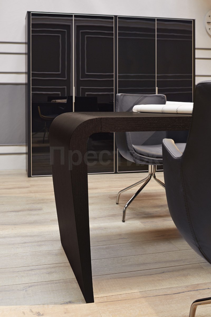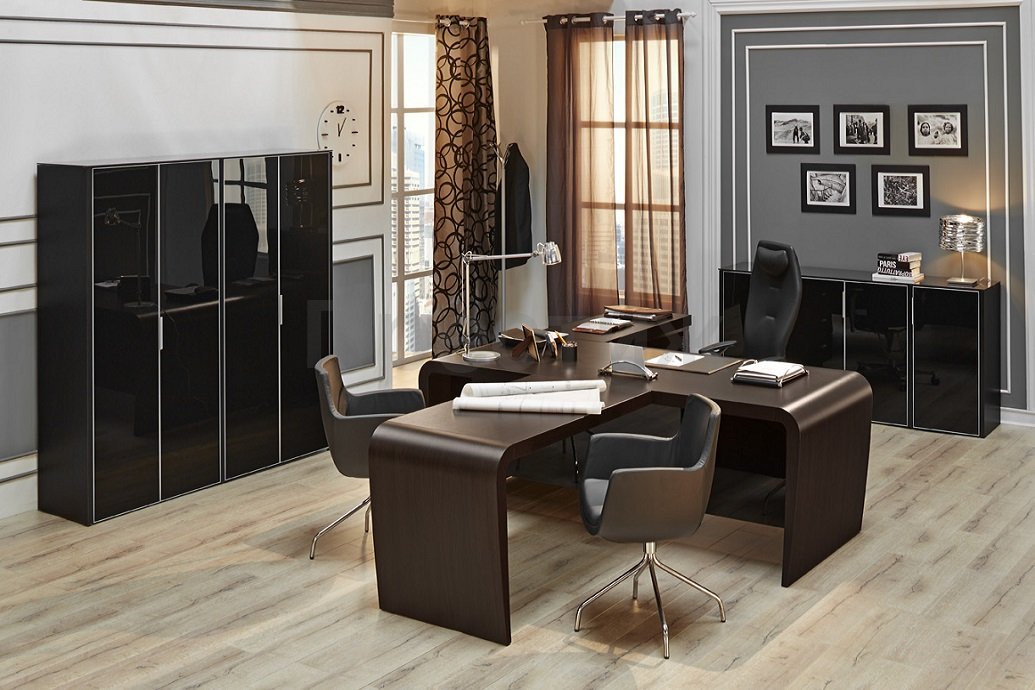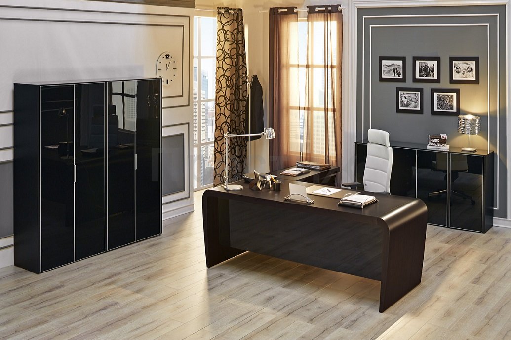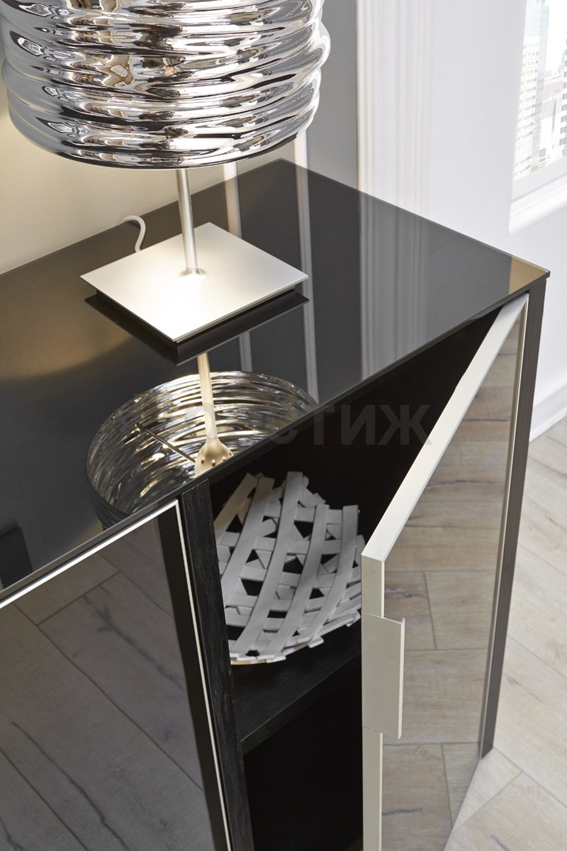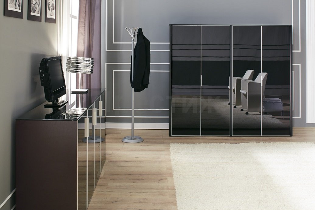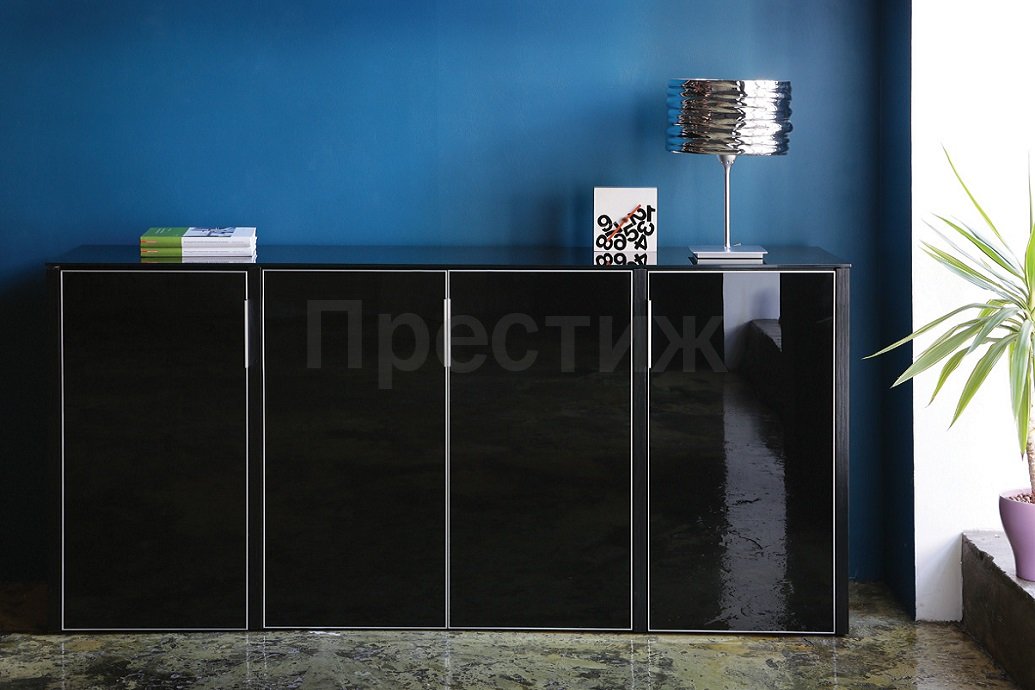 Греденция: высотой 88 см — 4 двери; каркас — черный меламин; двери — черное глянцевое закаленное стекло в алюминиевой раме; топ — черное глянцевое закаленное стекло